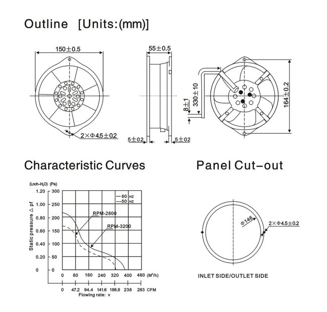 | Typ wentylatora | Rodzaj łożyska | Wyprowadzenia | Napięcie zasilania (VAC) | Częstotliwość (Hz) | Prąd znamionowy (A) | Pobór mocy (W) | Prędkość obrotowa (RPM) | Wydajność (m3/h) | Poziom hałasu (dBA) | Waga (g) |
